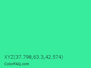 XYZ 37.798,63.3,42.574 Color is a normal green color and the nearest color is Eucalyptus #44d7a8. Hex code #38ec9e and RGB value is rgb(56,236,158). In RGB color space, this color is composed of 22% red, 93% green, 62% blue, In CMYK color space, this color is composed of 76% cyan, 0% magenta, 33% yellow , 7% black , In HSL color space, this color has a hue angle of 154° , 83% saturation and 57% lightness.