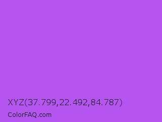 XYZ 37.799,22.492,84.787 Color is a light purple color and the nearest color is Medium Orchid #ba55d3. Hex code #b455f0 and RGB value is rgb(180,85,240). In RGB color space, this color is composed of 71% red, 33% green, 94% blue, In CMYK color space, this color is composed of 25% cyan, 65% magenta, 0% yellow , 6% black , In HSL color space, this color has a hue angle of 277° , 84% saturation and 64% lightness.