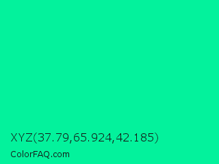 XYZ 37.79,65.924,42.185 Color is a normal green color and the nearest color is Medium Spring Green #00fa9a. Hex code #03f29c and RGB value is rgb(3,242,156). In RGB color space, this color is composed of 1% red, 95% green, 61% blue, In CMYK color space, this color is composed of 99% cyan, 0% magenta, 36% yellow , 5% black , In HSL color space, this color has a hue angle of 158° , 98% saturation and 48% lightness.