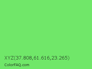 XYZ 37.808,61.616,23.265 Color is a light green color and the nearest color is Pastel Green #77dd77. Hex code #70e769 and RGB value is rgb(112,231,105). In RGB color space, this color is composed of 44% red, 91% green, 41% blue, In CMYK color space, this color is composed of 52% cyan, 0% magenta, 55% yellow , 9% black , In HSL color space, this color has a hue angle of 117° , 72% saturation and 66% lightness.