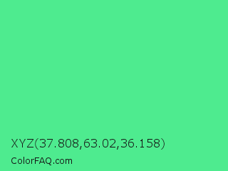 XYZ 37.808,63.02,36.158 Color is a light green color and the nearest color is Very Light Malachite Green #64e986. Hex code #4eeb8f and RGB value is rgb(78,235,143). In RGB color space, this color is composed of 31% red, 92% green, 56% blue, In CMYK color space, this color is composed of 67% cyan, 0% magenta, 39% yellow , 8% black , In HSL color space, this color has a hue angle of 145° , 80% saturation and 61% lightness.