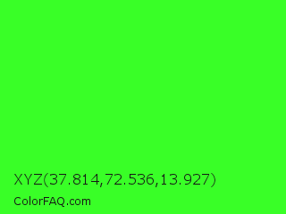 XYZ 37.814,72.536,13.927 Color is a normal green color and the nearest color is Neon Green #39ff14. Hex code #39ff27 and RGB value is rgb(57,255,39). In RGB color space, this color is composed of 22% red, 100% green, 15% blue, In CMYK color space, this color is composed of 78% cyan, 0% magenta, 85% yellow , 0% black , In HSL color space, this color has a hue angle of 115° , 100% saturation and 58% lightness.