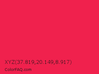 XYZ 37.819,20.149,8.917 Color is a normal red color and the nearest color is Red Crayola #ee204d. Hex code #f0214d and RGB value is rgb(240,33,77). In RGB color space, this color is composed of 94% red, 13% green, 30% blue, In CMYK color space, this color is composed of 0% cyan, 86% magenta, 68% yellow , 6% black , In HSL color space, this color has a hue angle of 347° , 87% saturation and 54% lightness.