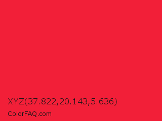 XYZ 37.822,20.143,5.636 Color is a normal red color and the nearest color is Imperial Red #ed2939. Hex code #f21f38 and RGB value is rgb(242,31,56). In RGB color space, this color is composed of 95% red, 12% green, 22% blue, In CMYK color space, this color is composed of 0% cyan, 87% magenta, 77% yellow , 5% black , In HSL color space, this color has a hue angle of 353° , 89% saturation and 54% lightness.