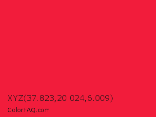 XYZ 37.823,20.024,6.009 Color is a normal red color and the nearest color is Imperial Red #ed2939. Hex code #f21c3b and RGB value is rgb(242,28,59). In RGB color space, this color is composed of 95% red, 11% green, 23% blue, In CMYK color space, this color is composed of 0% cyan, 88% magenta, 76% yellow , 5% black , In HSL color space, this color has a hue angle of 351° , 89% saturation and 53% lightness.