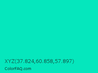 XYZ 37.824,60.858,57.897 Color is a normal cyan color and the nearest color is Robins Egg Blue #00cccc. Hex code #05e7bd and RGB value is rgb(5,231,189). In RGB color space, this color is composed of 2% red, 91% green, 74% blue, In CMYK color space, this color is composed of 98% cyan, 0% magenta, 18% yellow , 9% black , In HSL color space, this color has a hue angle of 169° , 96% saturation and 46% lightness.
