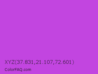 XYZ 37.831,21.107,72.601 Color is a normal purple color and the nearest color is Medium Orchid #ba55d3. Hex code #c245e0 and RGB value is rgb(194,69,224). In RGB color space, this color is composed of 76% red, 27% green, 88% blue, In CMYK color space, this color is composed of 13% cyan, 69% magenta, 0% yellow , 12% black , In HSL color space, this color has a hue angle of 288° , 71% saturation and 57% lightness.