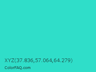 XYZ 37.836,57.064,64.279 Color is a normal cyan color and the nearest color is Turquoise PWG #30d5c8. Hex code #2fdec9 and RGB value is rgb(47,222,201). In RGB color space, this color is composed of 18% red, 87% green, 79% blue, In CMYK color space, this color is composed of 79% cyan, 0% magenta, 9% yellow , 13% black , In HSL color space, this color has a hue angle of 173° , 73% saturation and 53% lightness.