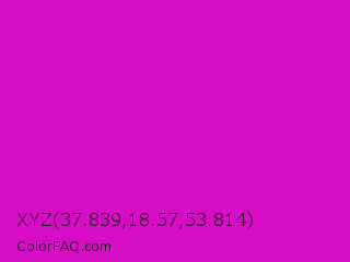 XYZ 37.839,18.57,53.814 Color is a normal magenta color and the nearest color is Deep Magenta #cc00cc. Hex code #d60dc4 and RGB value is rgb(214,13,196). In RGB color space, this color is composed of 84% red, 5% green, 77% blue, In CMYK color space, this color is composed of 0% cyan, 94% magenta, 8% yellow , 16% black , In HSL color space, this color has a hue angle of 305° , 89% saturation and 45% lightness.