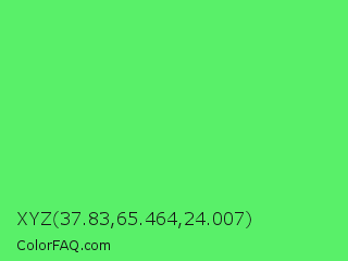 XYZ 37.83,65.464,24.007 Color is a light green color and the nearest color is Screamin Green #66ff66. Hex code #59f069 and RGB value is rgb(89,240,105). In RGB color space, this color is composed of 35% red, 94% green, 41% blue, In CMYK color space, this color is composed of 63% cyan, 0% magenta, 56% yellow , 6% black , In HSL color space, this color has a hue angle of 126° , 83% saturation and 65% lightness.