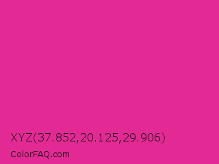 XYZ 37.852,20.125,29.906 Color is a normal magenta color and the nearest color is Barbie Pink #e0218a. Hex code #e32a94 and RGB value is rgb(227,42,148). In RGB color space, this color is composed of 89% red, 16% green, 58% blue, In CMYK color space, this color is composed of 0% cyan, 81% magenta, 35% yellow , 11% black , In HSL color space, this color has a hue angle of 326° , 77% saturation and 53% lightness.
