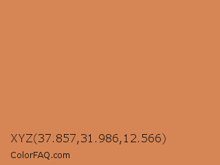 XYZ 37.857,31.986,12.566 Color is a normal orange color and the nearest color is Raw Sienna #d68a59. Hex code #d68654 and RGB value is rgb(214,134,84). In RGB color space, this color is composed of 84% red, 53% green, 33% blue, In CMYK color space, this color is composed of 0% cyan, 37% magenta, 61% yellow , 16% black , In HSL color space, this color has a hue angle of 23° , 61% saturation and 58% lightness.