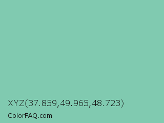 XYZ 37.859,49.965,48.723 Color is a light green color and the nearest color is Vista Blue #8fd6b4. Hex code #80cab0 and RGB value is rgb(128,202,176). In RGB color space, this color is composed of 50% red, 79% green, 69% blue, In CMYK color space, this color is composed of 37% cyan, 0% magenta, 13% yellow , 21% black , In HSL color space, this color has a hue angle of 159° , 41% saturation and 65% lightness.