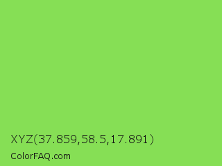 XYZ 37.859,58.5,17.891 Color is a normal green color and the nearest color is Kiwi #8ee53f. Hex code #86df55 and RGB value is rgb(134,223,85). In RGB color space, this color is composed of 53% red, 87% green, 33% blue, In CMYK color space, this color is composed of 40% cyan, 0% magenta, 62% yellow , 13% black , In HSL color space, this color has a hue angle of 99° , 68% saturation and 60% lightness.