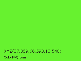 XYZ 37.859,66.593,13.548 Color is a normal green color and the nearest color is Spring Frost #87ff2a. Hex code #67f22f and RGB value is rgb(103,242,47). In RGB color space, this color is composed of 40% red, 95% green, 18% blue, In CMYK color space, this color is composed of 57% cyan, 0% magenta, 81% yellow , 5% black , In HSL color space, this color has a hue angle of 103° , 88% saturation and 57% lightness.