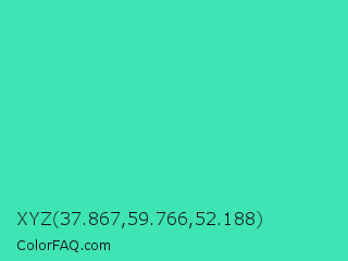 XYZ 37.867,59.766,52.188 Color is a normal green color and the nearest color is Eucalyptus #44d7a8. Hex code #3ee4b3 and RGB value is rgb(62,228,179). In RGB color space, this color is composed of 24% red, 89% green, 70% blue, In CMYK color space, this color is composed of 73% cyan, 0% magenta, 21% yellow , 11% black , In HSL color space, this color has a hue angle of 162° , 75% saturation and 57% lightness.