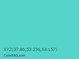 XYZ 37.86,53.236,64.157 Color is a normal cyan color and the nearest color is Medium Turquoise #48d1cc. Hex code #54d4ca and RGB value is rgb(84,212,202). In RGB color space, this color is composed of 33% red, 83% green, 79% blue, In CMYK color space, this color is composed of 60% cyan, 0% magenta, 5% yellow , 17% black , In HSL color space, this color has a hue angle of 175° , 60% saturation and 58% lightness.