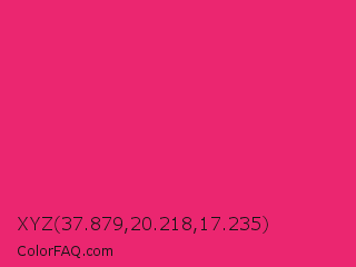 XYZ 37.879,20.218,17.235 Color is a normal rose color and the nearest color is Razzmatazz #e3256b. Hex code #eb2670 and RGB value is rgb(235,38,112). In RGB color space, this color is composed of 92% red, 15% green, 44% blue, In CMYK color space, this color is composed of 0% cyan, 84% magenta, 52% yellow , 8% black , In HSL color space, this color has a hue angle of 337° , 83% saturation and 54% lightness.