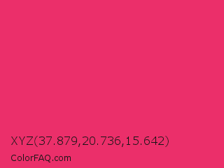 XYZ 37.879,20.736,15.642 Color is a normal rose color and the nearest color is Razzmatazz #e3256b. Hex code #eb2f6a and RGB value is rgb(235,47,106). In RGB color space, this color is composed of 92% red, 18% green, 42% blue, In CMYK color space, this color is composed of 0% cyan, 80% magenta, 55% yellow , 8% black , In HSL color space, this color has a hue angle of 341° , 82% saturation and 55% lightness.