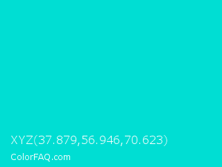 XYZ 37.879,56.946,70.623 Color is a normal cyan color and the nearest color is Dark Turquoise #00ced1. Hex code #00ded3 and RGB value is rgb(0,222,211). In RGB color space, this color is composed of 0% red, 87% green, 83% blue, In CMYK color space, this color is composed of 100% cyan, 0% magenta, 5% yellow , 13% black , In HSL color space, this color has a hue angle of 177° , 100% saturation and 44% lightness.