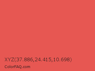 XYZ 37.886,24.415,10.698 Color is a light red color and the nearest color is Jelly Bean #da614e. Hex code #e75752 and RGB value is rgb(231,87,82). In RGB color space, this color is composed of 91% red, 34% green, 32% blue, In CMYK color space, this color is composed of 0% cyan, 62% magenta, 65% yellow , 9% black , In HSL color space, this color has a hue angle of 2° , 76% saturation and 61% lightness.