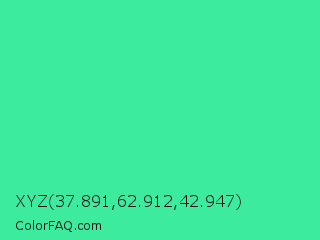 XYZ 37.891,62.912,42.947 Color is a normal green color and the nearest color is Eucalyptus #44d7a8. Hex code #3deb9f and RGB value is rgb(61,235,159). In RGB color space, this color is composed of 24% red, 92% green, 62% blue, In CMYK color space, this color is composed of 74% cyan, 0% magenta, 32% yellow , 8% black , In HSL color space, this color has a hue angle of 154° , 81% saturation and 58% lightness.