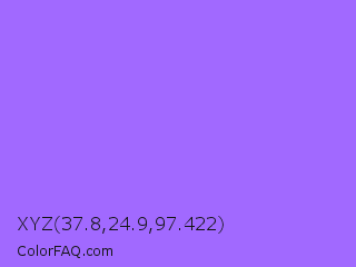 XYZ 37.8,24.9,97.422 Color is a light violet color and the nearest color is Navy Purple #9457eb. Hex code #a169ff and RGB value is rgb(161,105,255). In RGB color space, this color is composed of 63% red, 41% green, 100% blue, In CMYK color space, this color is composed of 37% cyan, 59% magenta, 0% yellow , 0% black , In HSL color space, this color has a hue angle of 262° , 100% saturation and 71% lightness.