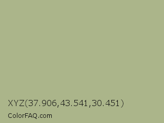 XYZ 37.906,43.541,30.451 Color is a light lime color and the nearest color is Swamp Green #acb78e. Hex code #abb58a and RGB value is rgb(171,181,138). In RGB color space, this color is composed of 67% red, 71% green, 54% blue, In CMYK color space, this color is composed of 6% cyan, 0% magenta, 24% yellow , 29% black , In HSL color space, this color has a hue angle of 74° , 23% saturation and 63% lightness.