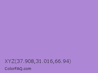 XYZ 37.908,31.016,66.94 Color is a light violet color and the nearest color is East Side #ac91ce. Hex code #ad87d5 and RGB value is rgb(173,135,213). In RGB color space, this color is composed of 68% red, 53% green, 84% blue, In CMYK color space, this color is composed of 19% cyan, 37% magenta, 0% yellow , 16% black , In HSL color space, this color has a hue angle of 269° , 48% saturation and 68% lightness.