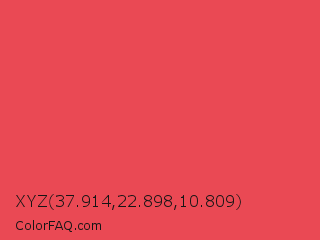 XYZ 37.914,22.898,10.809 Color is a normal red color and the nearest color is Desire #ea3c53. Hex code #ea4954 and RGB value is rgb(234,73,84). In RGB color space, this color is composed of 92% red, 29% green, 33% blue, In CMYK color space, this color is composed of 0% cyan, 69% magenta, 64% yellow , 8% black , In HSL color space, this color has a hue angle of 356° , 79% saturation and 60% lightness.