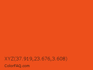 XYZ 37.919,23.676,3.608 Color is a normal color and the nearest color is Pomegranate #f34723. Hex code #ed4f1b and RGB value is rgb(237,79,27). In RGB color space, this color is composed of 93% red, 31% green, 11% blue, In CMYK color space, this color is composed of 0% cyan, 67% magenta, 89% yellow , 7% black , In HSL color space, this color has a hue angle of 15° , 85% saturation and 52% lightness.