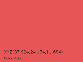 XYZ 37.924,24.174,11.684 Color is a light red color and the nearest color is Mandy #e25465. Hex code #e75557 and RGB value is rgb(231,85,87). In RGB color space, this color is composed of 91% red, 33% green, 34% blue, In CMYK color space, this color is composed of 0% cyan, 63% magenta, 62% yellow , 9% black , In HSL color space, this color has a hue angle of 359° , 75% saturation and 62% lightness.