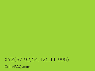 XYZ 37.92,54.421,11.996 Color is a normal green color and the nearest color is Yellow Green #9acd32. Hex code #9cd436 and RGB value is rgb(156,212,54). In RGB color space, this color is composed of 61% red, 83% green, 21% blue, In CMYK color space, this color is composed of 26% cyan, 0% magenta, 75% yellow , 17% black , In HSL color space, this color has a hue angle of 81° , 65% saturation and 52% lightness.