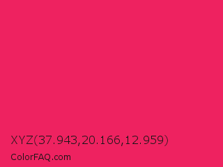 XYZ 37.943,20.166,12.959 Color is a normal rose color and the nearest color is Razzmatazz #e3256b. Hex code #ee2260 and RGB value is rgb(238,34,96). In RGB color space, this color is composed of 93% red, 13% green, 38% blue, In CMYK color space, this color is composed of 0% cyan, 86% magenta, 60% yellow , 7% black , In HSL color space, this color has a hue angle of 342° , 86% saturation and 53% lightness.
