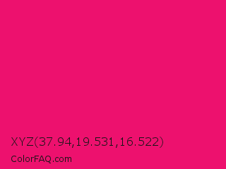 XYZ 37.94,19.531,16.522 Color is a normal rose color and the nearest color is Ruby #e0115f. Hex code #ed116e and RGB value is rgb(237,17,110). In RGB color space, this color is composed of 93% red, 7% green, 43% blue, In CMYK color space, this color is composed of 0% cyan, 93% magenta, 54% yellow , 7% black , In HSL color space, this color has a hue angle of 335° , 87% saturation and 50% lightness.