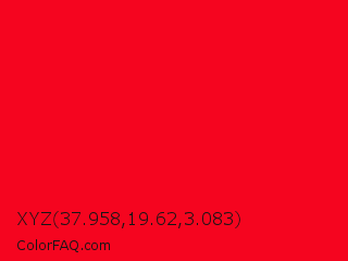 XYZ 37.958,19.62,3.083 Color is a normal red color and the nearest color is Vivid Red #f70d1a. Hex code #f5051f and RGB value is rgb(245,5,31). In RGB color space, this color is composed of 96% red, 2% green, 12% blue, In CMYK color space, this color is composed of 0% cyan, 98% magenta, 87% yellow , 4% black , In HSL color space, this color has a hue angle of 354° , 96% saturation and 49% lightness.