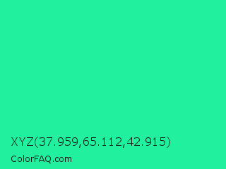 XYZ 37.959,65.112,42.915 Color is a normal green color and the nearest color is Medium Spring Green #00fa9a. Hex code #21f09e and RGB value is rgb(33,240,158). In RGB color space, this color is composed of 13% red, 94% green, 62% blue, In CMYK color space, this color is composed of 86% cyan, 0% magenta, 34% yellow , 6% black , In HSL color space, this color has a hue angle of 156° , 87% saturation and 54% lightness.
