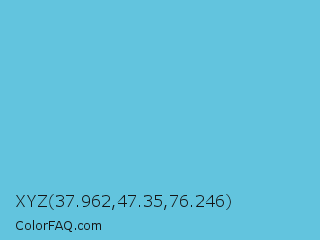XYZ 37.962,47.35,76.246 Color is a light cyan color and the nearest color is Viking #64ccdb. Hex code #62c4de and RGB value is rgb(98,196,222). In RGB color space, this color is composed of 38% red, 77% green, 87% blue, In CMYK color space, this color is composed of 56% cyan, 12% magenta, 0% yellow , 13% black , In HSL color space, this color has a hue angle of 193° , 65% saturation and 63% lightness.