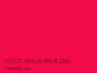 XYZ 37.963,19.589,8.259 Color is a normal rose color and the nearest color is Red Ribbon #ed0a3f. Hex code #f20a4a and RGB value is rgb(242,10,74). In RGB color space, this color is composed of 95% red, 4% green, 29% blue, In CMYK color space, this color is composed of 0% cyan, 96% magenta, 69% yellow , 5% black , In HSL color space, this color has a hue angle of 343° , 92% saturation and 49% lightness.