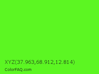 XYZ 37.963,68.912,12.814 Color is a normal green color and the nearest color is Bright Green #66ff00. Hex code #5cf722 and RGB value is rgb(92,247,34). In RGB color space, this color is composed of 36% red, 97% green, 13% blue, In CMYK color space, this color is composed of 63% cyan, 0% magenta, 86% yellow , 3% black , In HSL color space, this color has a hue angle of 104° , 93% saturation and 55% lightness.