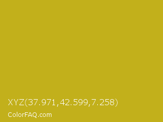 XYZ 37.971,42.599,7.258 Color is a normal yellow color and the nearest color is Hokey Pokey #c8a528. Hex code #c2b01b and RGB value is rgb(194,176,27). In RGB color space, this color is composed of 76% red, 69% green, 11% blue, In CMYK color space, this color is composed of 0% cyan, 9% magenta, 86% yellow , 24% black , In HSL color space, this color has a hue angle of 54° , 76% saturation and 43% lightness.