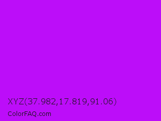 XYZ 37.982,17.819,91.06 Color is a normal purple color and the nearest color is Electric Purple #bf00ff. Hex code #bc0df9 and RGB value is rgb(188,13,249). In RGB color space, this color is composed of 74% red, 5% green, 98% blue, In CMYK color space, this color is composed of 24% cyan, 95% magenta, 0% yellow , 2% black , In HSL color space, this color has a hue angle of 284° , 95% saturation and 51% lightness.