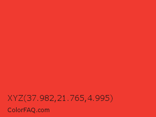 XYZ 37.982,21.765,4.995 Color is a normal red color and the nearest color is Deep Carmine Pink #ef3038. Hex code #f03a30 and RGB value is rgb(240,58,48). In RGB color space, this color is composed of 94% red, 23% green, 19% blue, In CMYK color space, this color is composed of 0% cyan, 76% magenta, 80% yellow , 6% black , In HSL color space, this color has a hue angle of 3° , 86% saturation and 56% lightness.