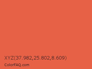 XYZ 37.982,25.802,8.609 Color is a normal red color and the nearest color is Jelly Bean #da614e. Hex code #e66145 and RGB value is rgb(230,97,69). In RGB color space, this color is composed of 90% red, 38% green, 27% blue, In CMYK color space, this color is composed of 0% cyan, 58% magenta, 70% yellow , 10% black , In HSL color space, this color has a hue angle of 10° , 76% saturation and 59% lightness.