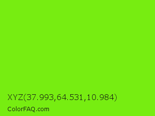 XYZ 37.993,64.531,10.984 Color is a normal green color and the nearest color is Lawn Green #7cfc00. Hex code #77ed11 and RGB value is rgb(119,237,17). In RGB color space, this color is composed of 47% red, 93% green, 7% blue, In CMYK color space, this color is composed of 50% cyan, 0% magenta, 93% yellow , 7% black , In HSL color space, this color has a hue angle of 92° , 87% saturation and 50% lightness.