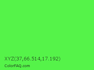 XYZ 37,66.514,17.192 Color is a light green color and the nearest color is Screamin Green #66ff66. Hex code #55f349 and RGB value is rgb(85,243,73). In RGB color space, this color is composed of 33% red, 95% green, 29% blue, In CMYK color space, this color is composed of 65% cyan, 0% magenta, 70% yellow , 5% black , In HSL color space, this color has a hue angle of 116° , 88% saturation and 62% lightness.