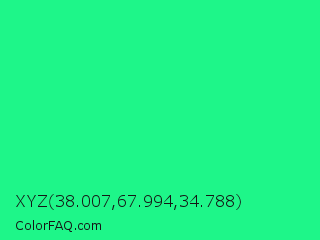 XYZ 38.007,67.994,34.788 Color is a normal green color and the nearest color is Spring Green #00ff7f. Hex code #1ef689 and RGB value is rgb(30,246,137). In RGB color space, this color is composed of 12% red, 96% green, 54% blue, In CMYK color space, this color is composed of 88% cyan, 0% magenta, 44% yellow , 4% black , In HSL color space, this color has a hue angle of 150° , 92% saturation and 54% lightness.