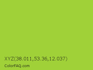 XYZ 38.011,53.36,12.037 Color is a normal lime color and the nearest color is Yellow Green #9acd32. Hex code #a0d138 and RGB value is rgb(160,209,56). In RGB color space, this color is composed of 63% red, 82% green, 22% blue, In CMYK color space, this color is composed of 23% cyan, 0% magenta, 73% yellow , 18% black , In HSL color space, this color has a hue angle of 79° , 62% saturation and 52% lightness.
