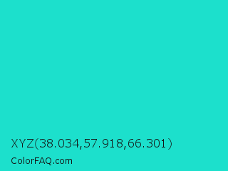 XYZ 38.034,57.918,66.301 Color is a normal cyan color and the nearest color is Turquoise PWG #30d5c8. Hex code #1ce0cc and RGB value is rgb(28,224,204). In RGB color space, this color is composed of 11% red, 88% green, 80% blue, In CMYK color space, this color is composed of 88% cyan, 0% magenta, 9% yellow , 12% black , In HSL color space, this color has a hue angle of 174° , 78% saturation and 49% lightness.