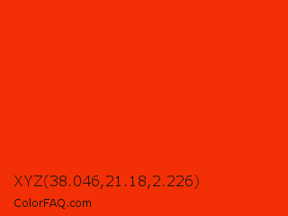 XYZ 38.046,21.18,2.226 Color is a normal red color and the nearest color is Coquelicot #ff3800. Hex code #f33005 and RGB value is rgb(243,48,5). In RGB color space, this color is composed of 95% red, 19% green, 2% blue, In CMYK color space, this color is composed of 0% cyan, 80% magenta, 98% yellow , 5% black , In HSL color space, this color has a hue angle of 11° , 96% saturation and 49% lightness.